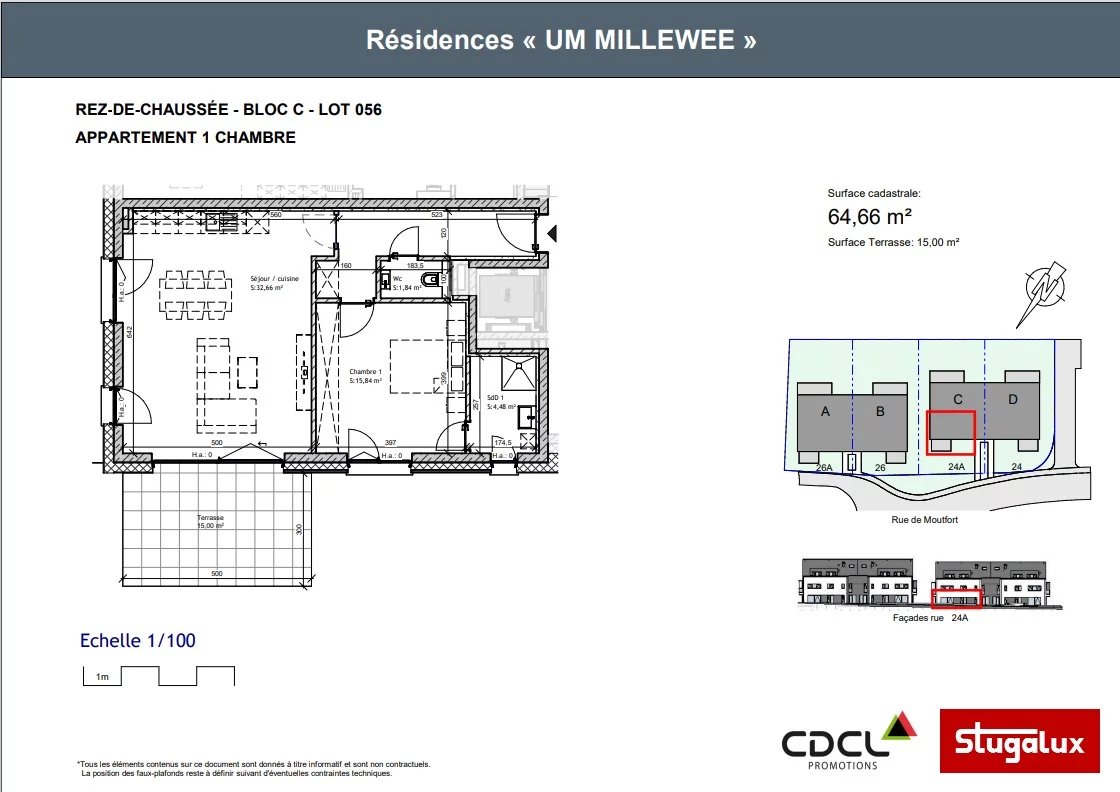 With a floor area of 64.5 m2 and a 15 m2 terrace, this ground-floor apartment is composed as follows: